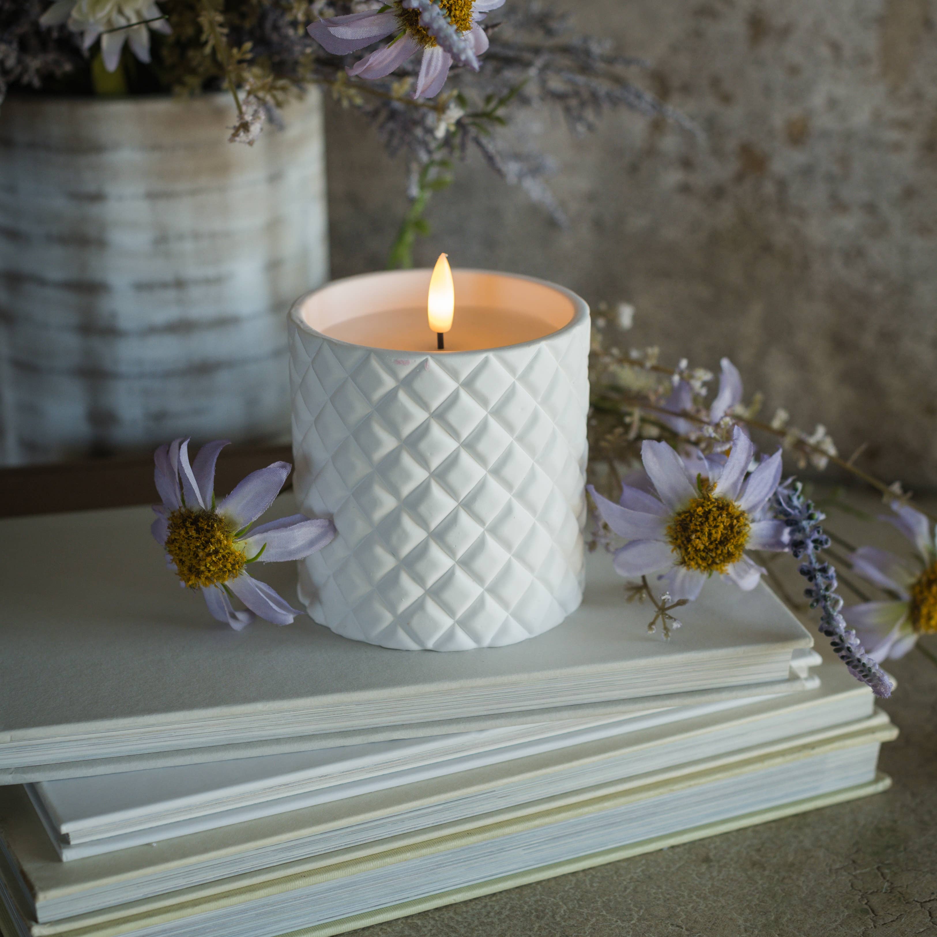 Introducing 4" White Cement Grid 3D Flame Candle. This unique blend of cement and wax is designed to enhance your decor with its understated elegance. The candle measures 4"L x 4"W x 4.5"H, making it a versatile addition to any decor style. The white hue adds a touch of sophistication.