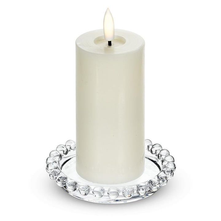 Elegant and versatile, this clear glass base features a subtle ball-edge detail, making it suitable for both pillar candles and wine bottles. Its timeless design pairs seamlessly with classic or contemporary decor.