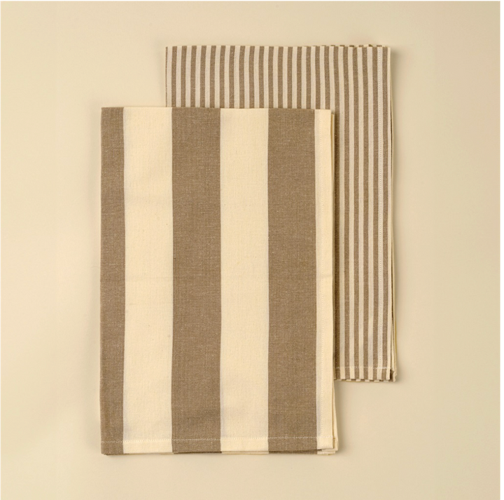 Upgrade your kitchen with the Hampton Stripe Tea Towels, a charming and practical set that doubles as accent decor for the kitchen. Woven from 100% cotton and made in India, each towel features a unique stripe design, one wide, one narrow. These handcrafted products are soft, absorbent, and coordinate beautifully with our matching oven mitts to bring cohesive style to your kitchen essentials collection.