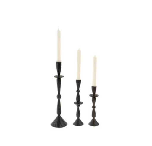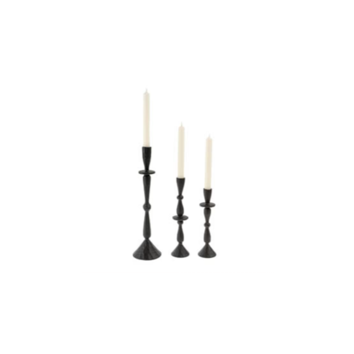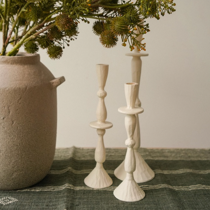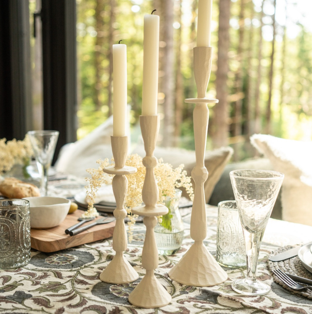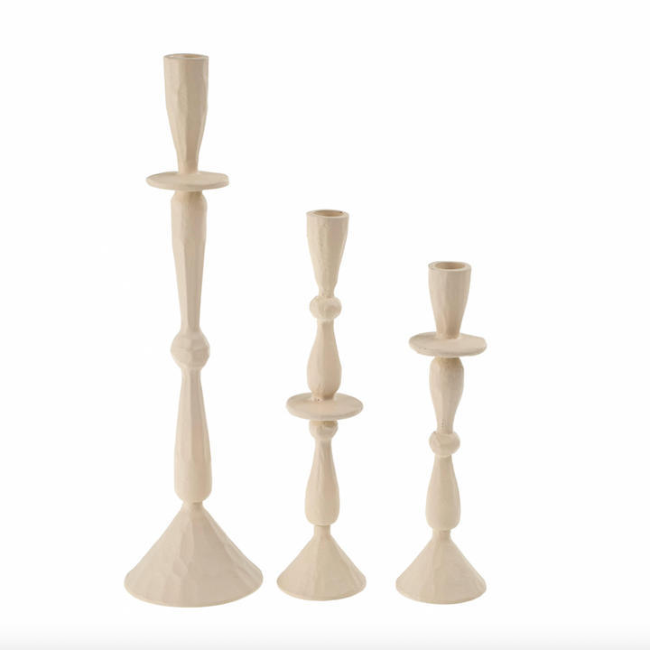 Elevate your tablescape with the hand forged aluminum Imani Candle Holder, handmade in Moradabad, a city in India celebrated for its metal craftsmanship. The creamy neutral powder coating seamlessly combines contemporary flair with traditional manufacturing techniques, resulting in a stunning matte finish that exudes dramatic character. Add a sense of romance and occasion to everyday evenings by lighting candles at dinnertime, or by curating a vignette with a mix of sizes on a side console.