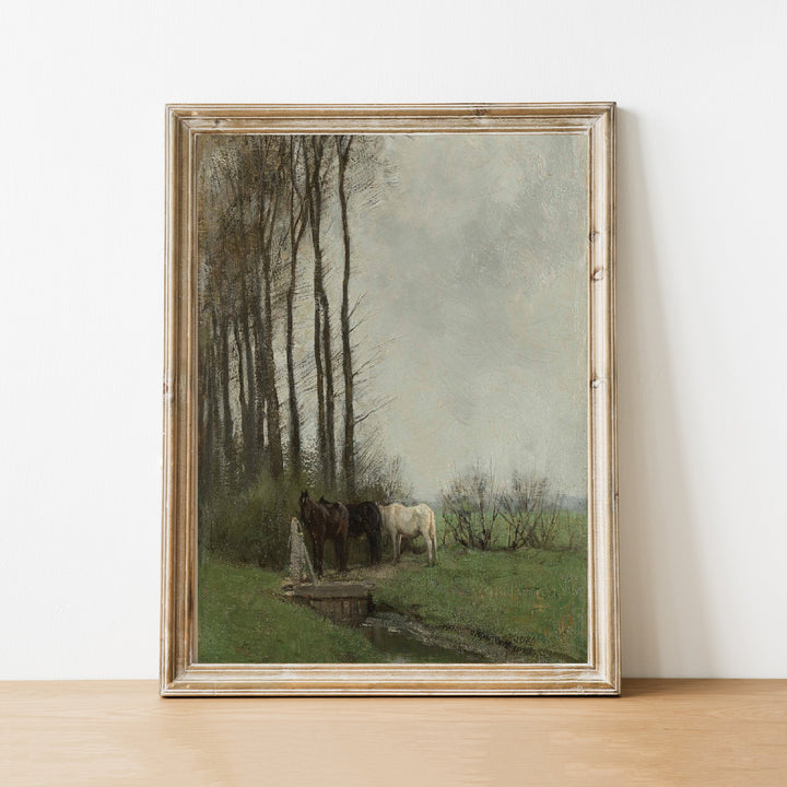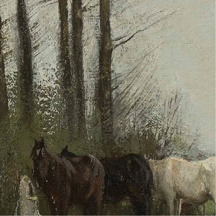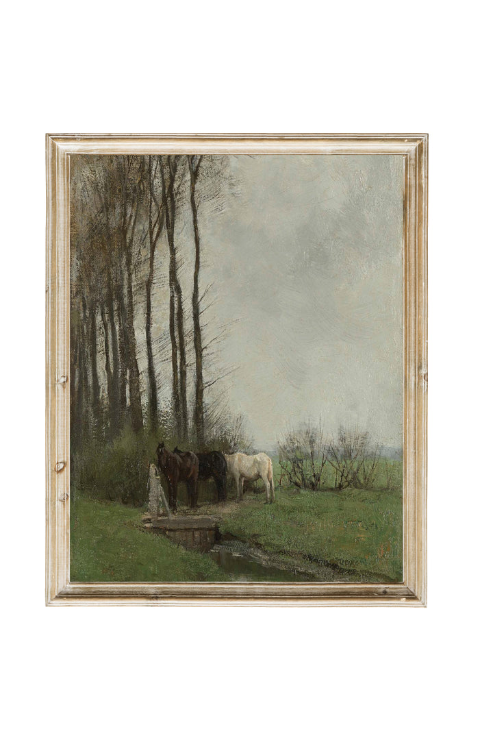 Experience the serenity of the countryside with the Wandering Vintage Print. Featuring a tranquil tree line adorned with horses and a subtle wandering path, this print adds a graceful touch to any space. Discover a new level of peacefulness with classic vintage style.