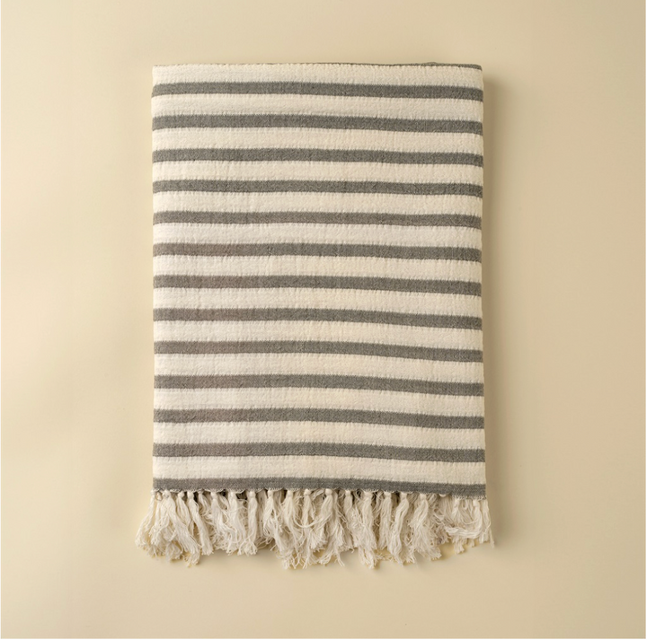Lightweight and effortlessly stylish, the Castaway Cotton Throw is your new go-to for coastal-inspired comfort. Woven from soft, natural cotton, this summer-weight throw blanket features cream and charcoal grey stripes, a hand-knotted fringe, and a breezy feel that suits any season. Whether draped over a chair, layered on a bed, or packed in your picnic basket, it’s the kind of piece that goes where you go.