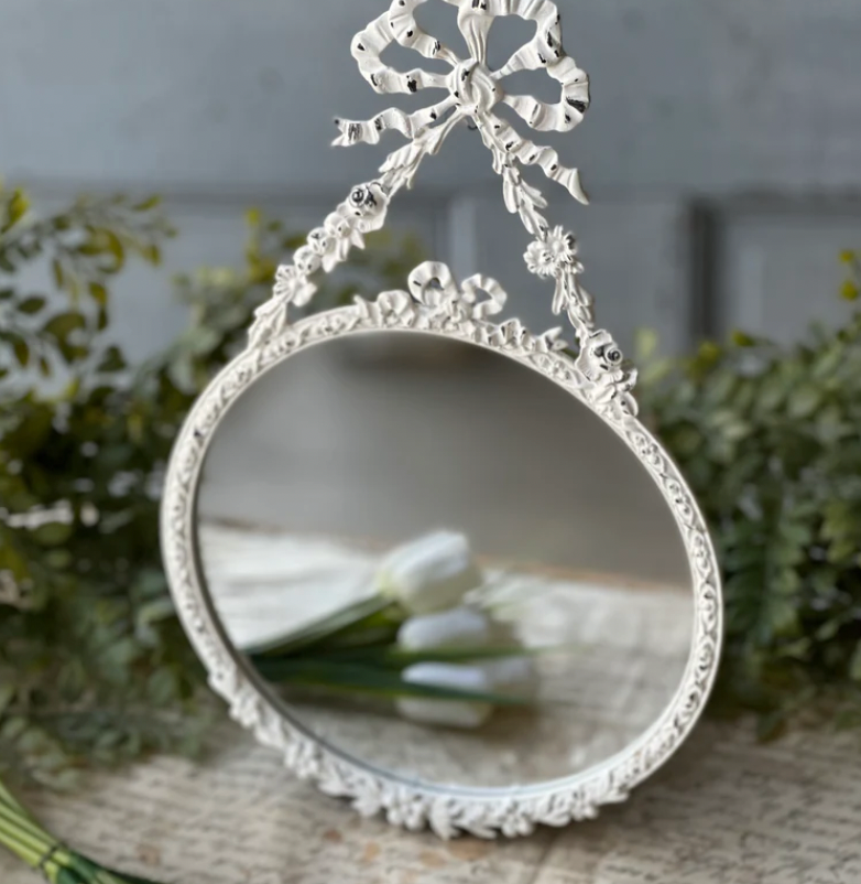 The vintage inspired bow mirror brings charming reflections with its lovely frame with attractive detailing and distressed finish.